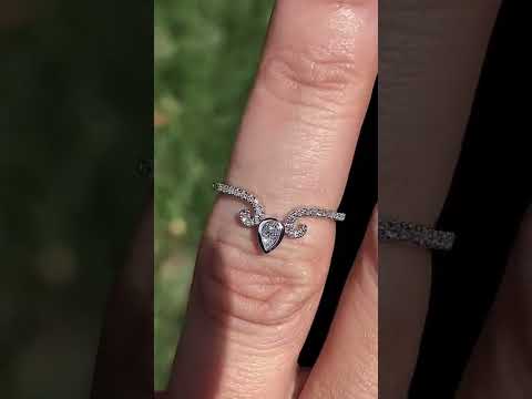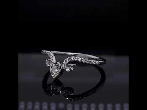 This beautiful Moissanite stackable band features an unique curved design with a single 4x2.5mm/0.12ct pear cut colorless Moissanite gemstone and 0.13ct of round colorless side stones, cast in your choice of 14k gold, 18k gold or platinum. The band width is approximately 1.3mm at the bottom of the band and is 8.3mm wide at the top of the band.
