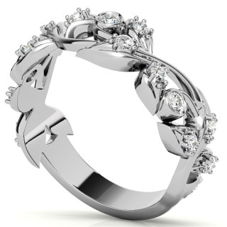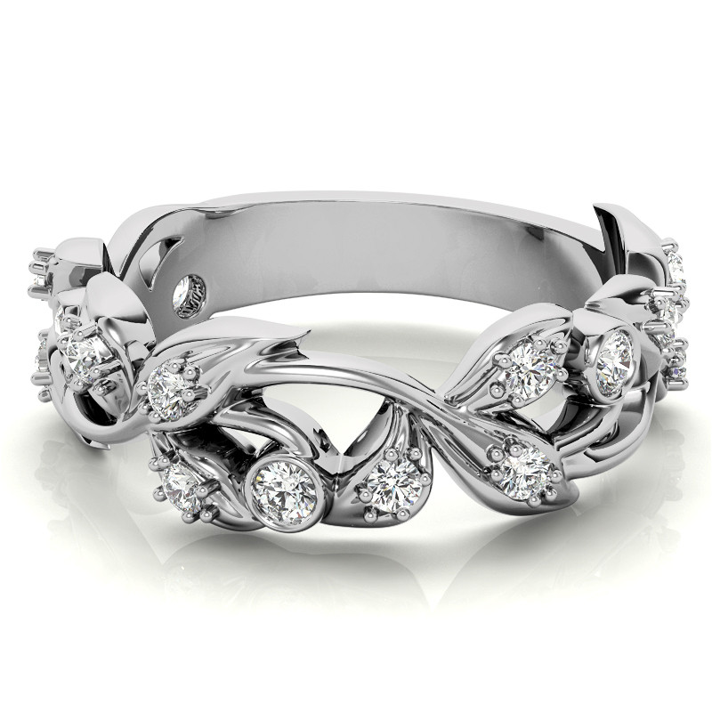 This beautiful Moissanite stackable band features a floral design with 0.36ct of round brilliant cut Moissanite stones, cast in your choice of 14k gold, 18k gold or platinum. The band width is approximately 4.6mm at the base of the band and 7.4mm at its widest point.