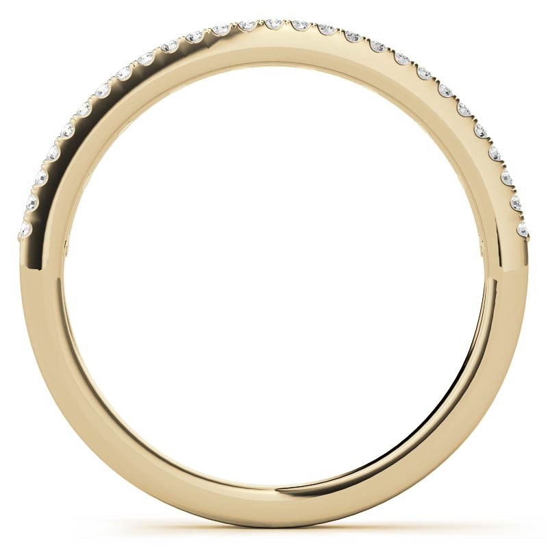 This beautiful Moissanite stackable band features a double row style design with 0.10ct of 0.9mm round and 0.54ct of 3x1.5mm baguette cut colorless Moissanite side stones, cast in your choice of 14k gold, 18k gold or platinum. The band width is approximately 1.8mm at the base of the ring and 3.1mm at its widest point.