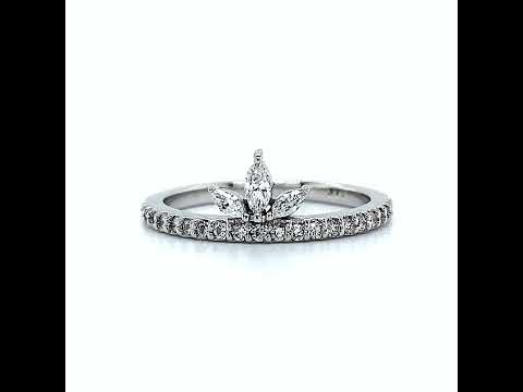 This beautiful Moissanite stackable band features a crown inspired design with a 4x2mm/0.07ct and two 3x1.5mm/0.04ct marquises and 0.23ct of round colorless Moissanite stones in your choice of 14k gold, 18k gold or platinum.