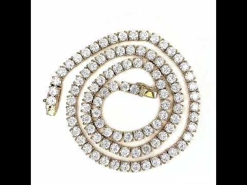 This beautiful tennis necklace features 4.5mm/0.33ct round brilliant colorless Moissanite gems, set in 14k white, yellow or rose gold. The total carat weight varies from 28.4ct - 35.3ct depending on the length chosen.
