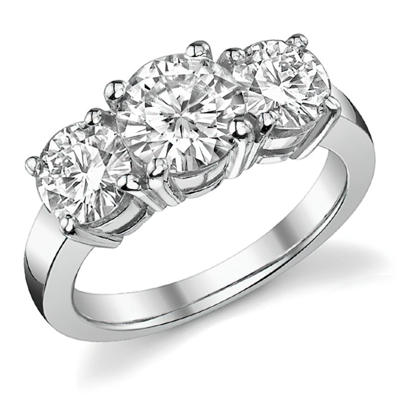 This breathtaking engagement ring is one of the many classic three-stone designs that we offer, and it's sure to leave a lasting impression. The ring features three magnificent round brilliant Moissanite gemstones that are basket set and beautifully displayed atop a plain band design.