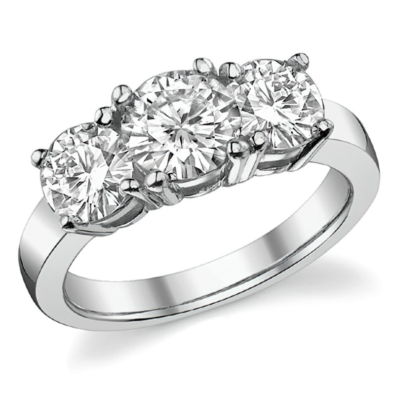 This breathtaking engagement ring is one of the many classic three-stone designs that we offer, and it's sure to leave a lasting impression. The ring features three magnificent round brilliant Moissanite gemstones that are basket set and beautifully displayed atop a plain band design.