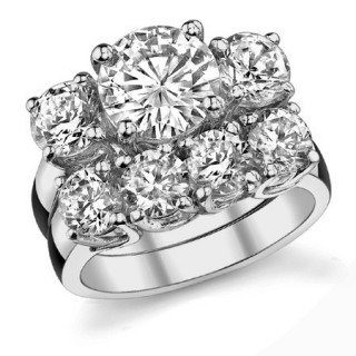 Within this extraordinary collection, you'll discover a variety of combinations, ensuring the perfect trio that resonates with your unique taste and style. This particular ring is adorned with a striking 8mm/2.0ct round center stone, elegantly complemented by two 5mm/0.50ct side stones, culminating in an impressive total carat weight of 3.0ctw. To complete the ensemble, an optional matching band is available, featuring four 4mm/0.25ct round brilliant Moissanite gemstones, creating a harmonious 1.0tcw arrangement.