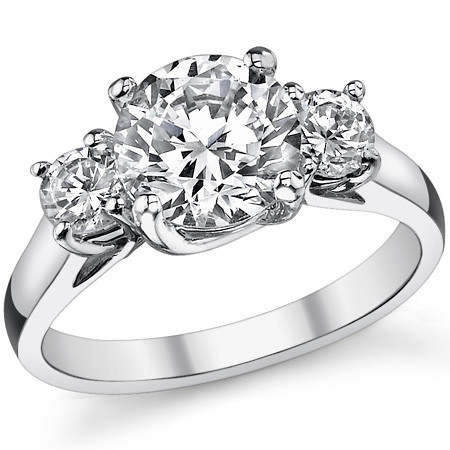 Within this extraordinary collection, you'll discover a variety of combinations, ensuring the perfect trio that resonates with your unique taste and style. This particular ring is adorned with a striking 8mm/2.0ct round center stone, elegantly complemented by two 4mm/0.25ct side stones, culminating in an impressive total carat weight of 2.5ctw.