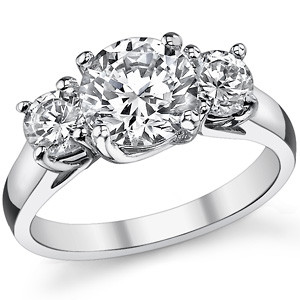 Within this extraordinary collection, you'll discover a variety of combinations, ensuring the perfect trio that resonates with your unique taste and style. This particular ring is adorned with a striking 7.5mm/1.5ct round center stone, elegantly complemented by two 4.5mm/0.33ct side stones, culminating in an impressive total carat weight of 2.16ctw.