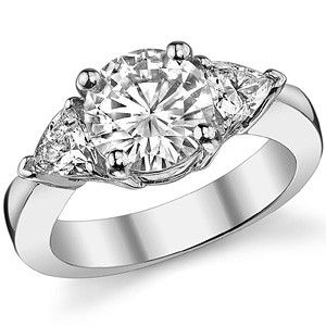 This beautiful three stone Moissanite ring features a 2.0ct (8.0mm) round brilliant Moissanite center and two 4.5mm (0.35ct each) trillion cut Moissanite side stones for a total of 2.7 ct, set in 14k gold, 18k gold or platinum.