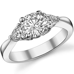 This beautiful three stone Moissanite ring features a 0.75ct (6.0mm) round brilliant Moissanite center and two 4mm (0.26ct each) trillion cut Moissanite side stones for a total of 1.3 ct, set in 14k gold, 18k gold or platinum.
