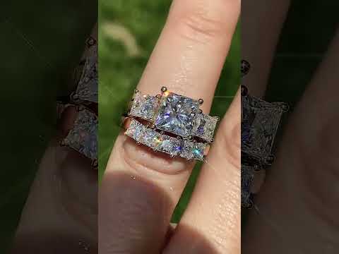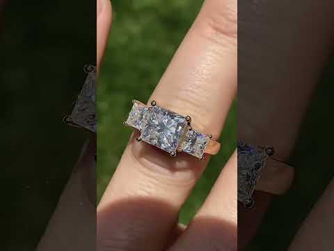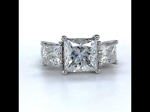 This beautiful three stone Moissanite ring features a 3.2ct (8mm) princess cut Moissanite center, two 5mm (0.82ct each) princess cut Moissanite side stones for a total of 4.8 ct, set in 14k gold, 18k gold or platinum.