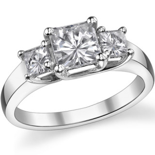 This beautiful lucern three stone Moissanite ring features a 1.05ct (5.5mm) princess cut Moissanite center, two 3.5mm (0.28ct each) princess cut Moissanite side stones for a total of 1.6 ct, set in 14k gold, 18k gold or platinum.