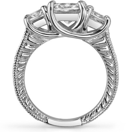 This beautiful antique-style three stone Moissanite ring features a 2.2ct (7mm) princess cut Moissanite center, two 5mm (0.82ct each) and six 2mm round brilliant Moissanite side stones for a total of 4.0 ct, set in 14k gold, 18k gold or platinum.