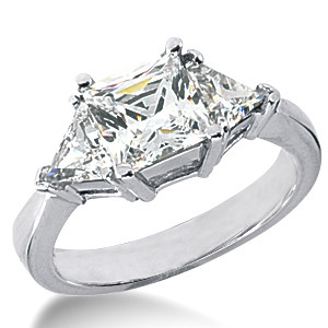 This beautiful three stone Moissanite ring features a 1.7ct (6.5mm) princess cut Moissanite center and two 4.5mm (0.34ct each) trillion cut Moissanite side stones for a total of 2.4ct, set in 14k gold, 18k gold or platinum.