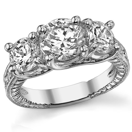 #thr218j 2.9ct (7mm,6mm) Round Brilliant Moissanite Antique Trellis 3-Stone Ring