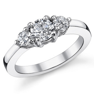 This beautiful 3-stone ring features a 0.75ct/6mm round brilliant Moissanite center stone, two 0.25ct/4mm round brilliant Moissanite gemstones, and is set in 14k gold, 18k gold or platinum. Add the optional matching band to make it a complete bridal set.
