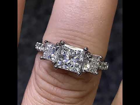 This beautiful Square Moissanite three stone engagement ring features a simple yet elegant design, a 1.7ct/6.5mm princess cut Moissanite center stone, two .60ct/4.5mm princess cut Moissanite side stones. It is available in 14k white gold, 14k yellow gold, 14k 2-tone gold (14k yellow gold band, 14k white gold prongs)and platinum. Available in 18k white, yellow, and 2-tone gold for special order.