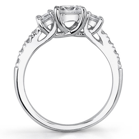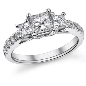 This beautiful Square Moissanite three stone engagement ring features a simple yet elegant design, a 0.8ct/5.0mm princess cut Moissanite center stone, two .30ct/3.5mm princess cut Moissanite side stones. It is available in 14k white gold, 14k yellow gold, 14k 2-tone gold (14k yellow gold band, 14k white gold prongs)and platinum. Available in 18k white, yellow, and 2-tone gold for special order.