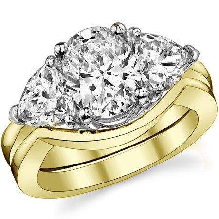 This beautiful 3-stone ring features a 9x7mm/2.25ct oval cut colorless Moissanite center stone, two 6mm/0.80ct trillion cut colorless Moissanite side stones for a total of 3.85ct, set in 14k gold, 18k gold or platinum (14k 2-tone includes a yellow gold band and white gold settings)