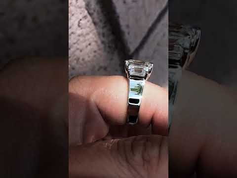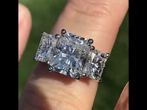 This beautiful 3-stone ring features a trellis style design with a 10x8mm (3.5ct) radiant / emerald cut Moissanite center stone and two 7x5mm (1ct each) radiant / emerald cut Moissanite side stones, set in 14k gold, 18k gold or platinum.