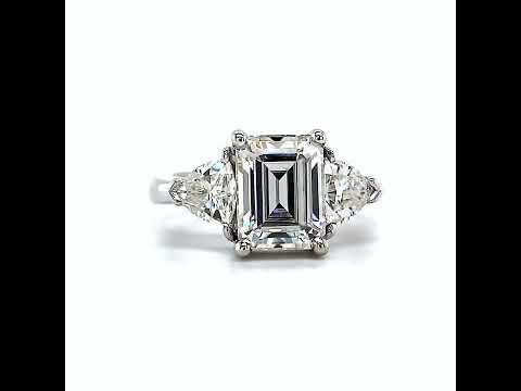 This beautiful ring features a classic 3-stone design with a 10x8mm (3.5ct) radiant or emerald cut Moissanite center stone and two 6mm Moissanite trillion cut side stones (0.8ct each), set in 14k gold, 18k gold or platinum.